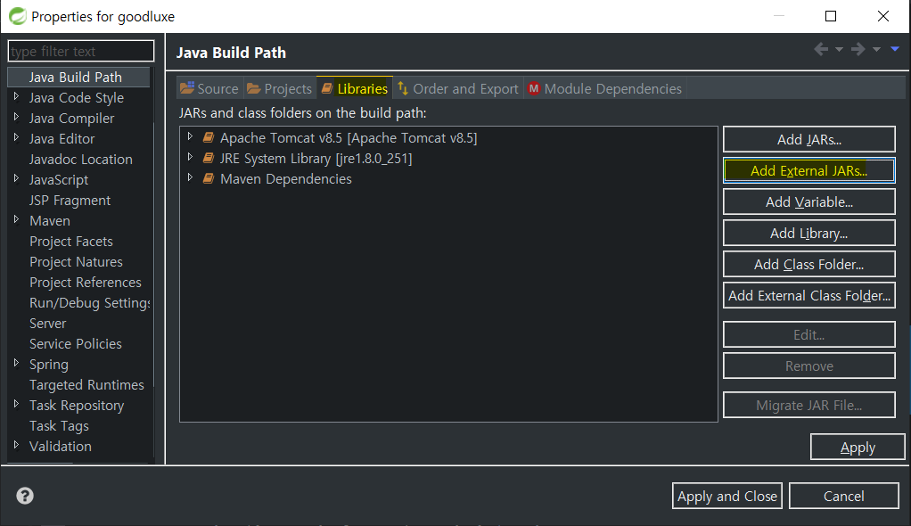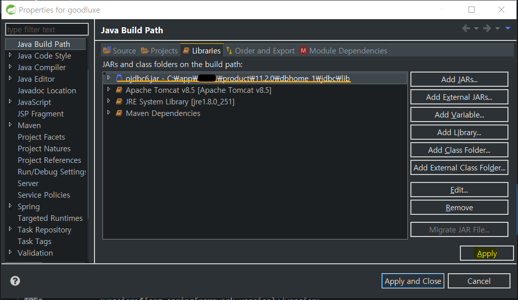 ② Libraries - Add External Jars.. > ojdbc6 파일경로로 이동해서 ojdbc6 선택 - 열기 > Apply