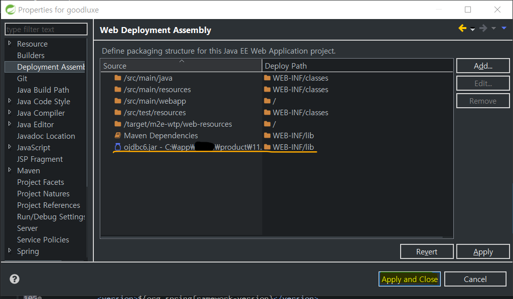 ③ Deployment Assembly - Add.. > Java Build Path Entries - Next > ojdbc6.jar - Finish > Apply and Close